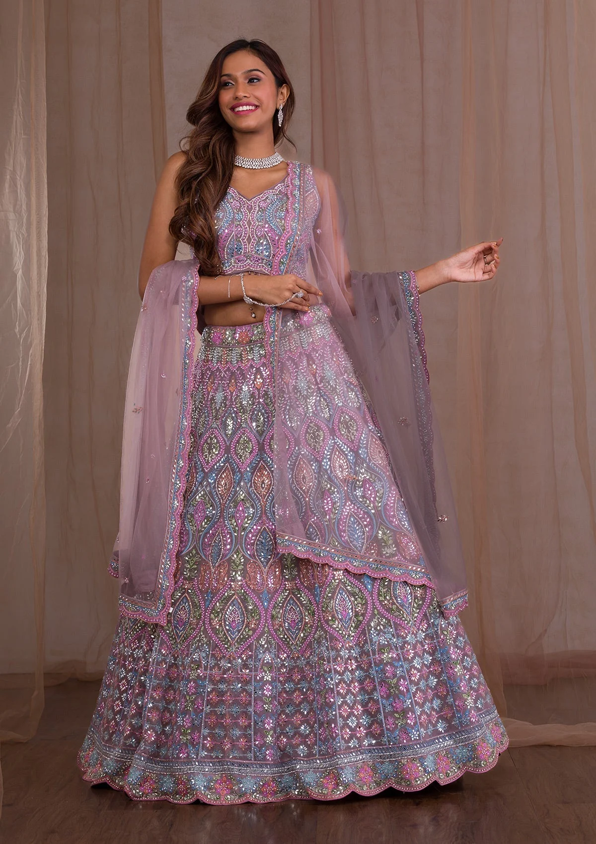 Lavender Mirrorwork Net Readymade Lehenga